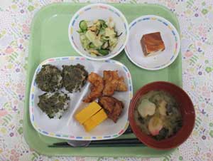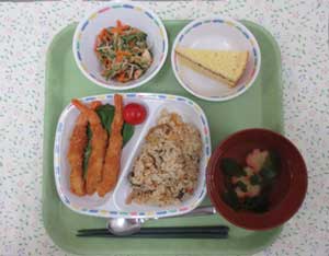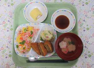 行事食等入学式、卒業式、創立記念日、こどもの日、スポーツフェスタ、土用の丑の日、クリスマス会、二十歳のつどい、お誕生日会(毎月第1金曜日)、手作りおやつ(バレンタイン・ホワイトデーなど) |