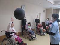 普段は個別活動が主ですが、皆で向かい合い、風船のラリーが続くことでとても盛り上がりました。 利用者様が風船に手を伸ばしやすいように、風船には紐を付けてセラピストがコントロールできる工夫をしています。上手に打ち返せなくてもすぐにやり直せることで、達成感も高まりました。お名前を呼ぶと手を挙げて構えたり、他の方が打った風船がご自身の元へ飛んでくるかもしれないという気持ちで風船の動きを目で追ったり、楽しみながら身体を動かすことができました。